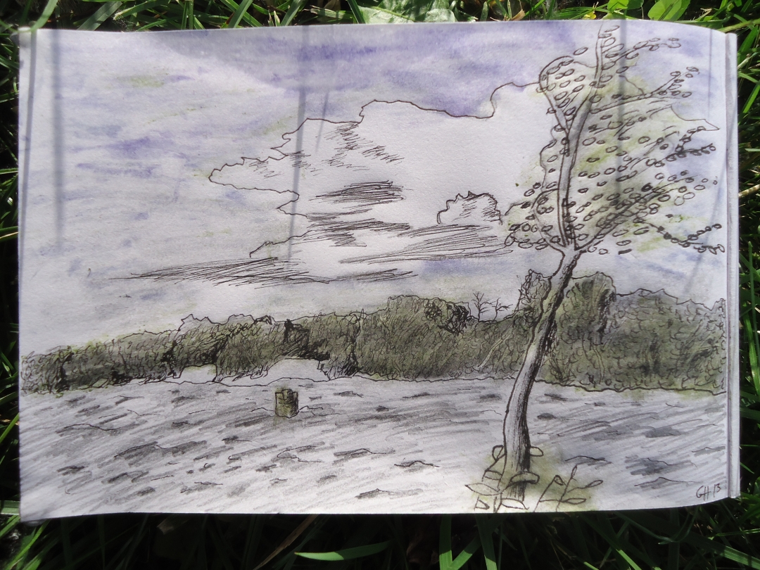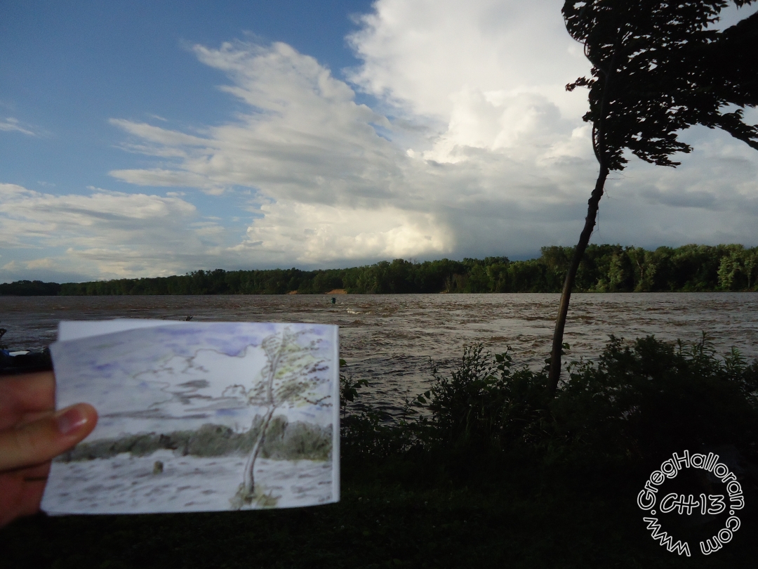 Hannah noticed some of the neighbors were staring at us. Our concern for their concern was quickly diminished when we met Bill. Bill was the owner of the backyard we had used to stage our river rescue scene. Of course, he and Hannah became friends immediately and soon we were sipping Coronas at his picnic table. He told us about the disasters he had seen while living in view of the dam and he was glad we had pulled over. Hannah interviewed him and I tried to seem thankful for the beverage while I politely ignored the conversation and sketched the channel. Bill was a dairy farmer. He had served in a non-combat position during The Vietnam War. He remembered the shirts that said “Kill ’em all and let God sort ’em out.” He had skydived, tripped acid at a Yes concert, and believed everything happens for a reason.
