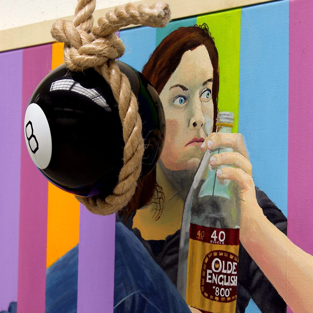 The Twelve Steps are Giant Steps is a series of acrylic paintings and poems that show the fatal nature of addiction. Some people can float along holding the Magic-8-Ball-of-Fate like a balloon. Others are dragged down by it like a ball and chain. Some have their identities totally obscured by it. Living with a personal addiction or caring for an addict is like sitting beneath the sword of Damocles.